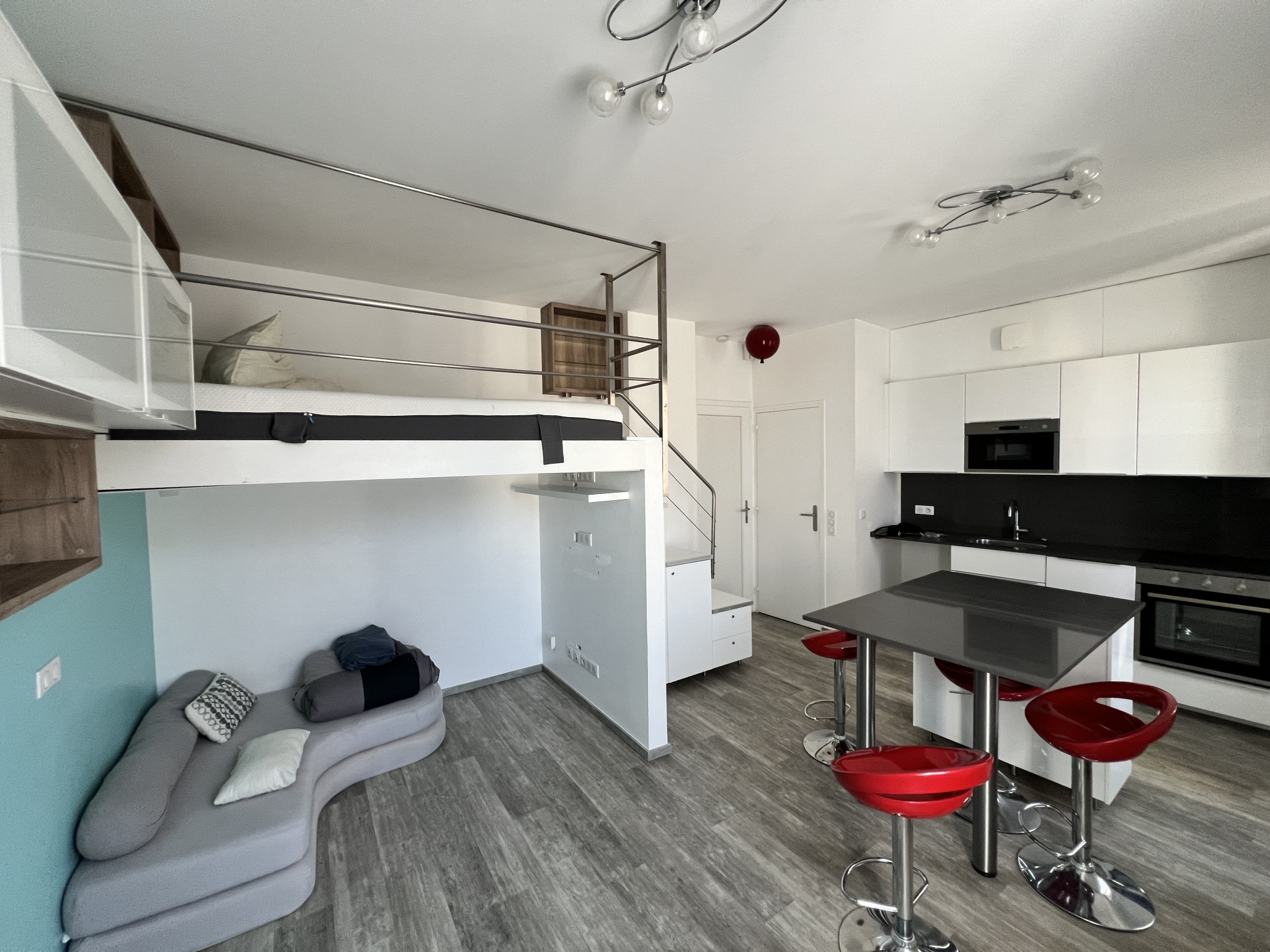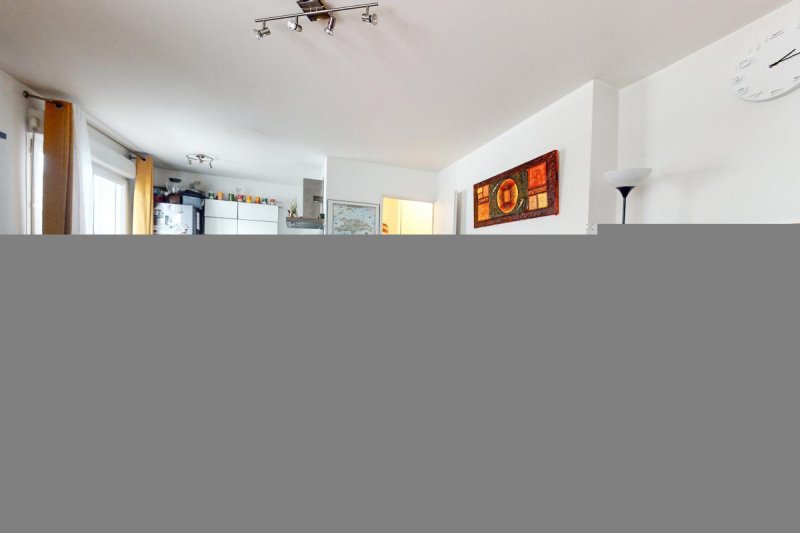 Pièce de vie lumineuse de 26m² avec une cuisine ouverte, idéale pour partager des moments conviviaux.