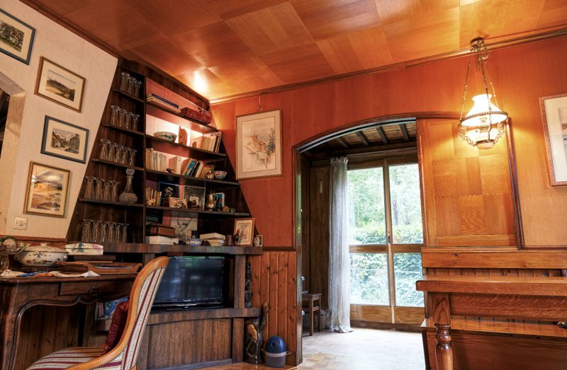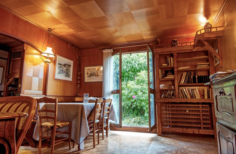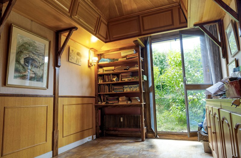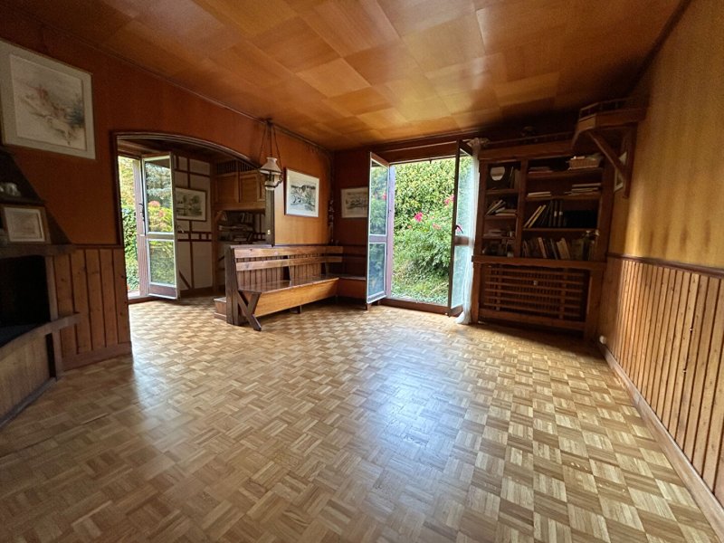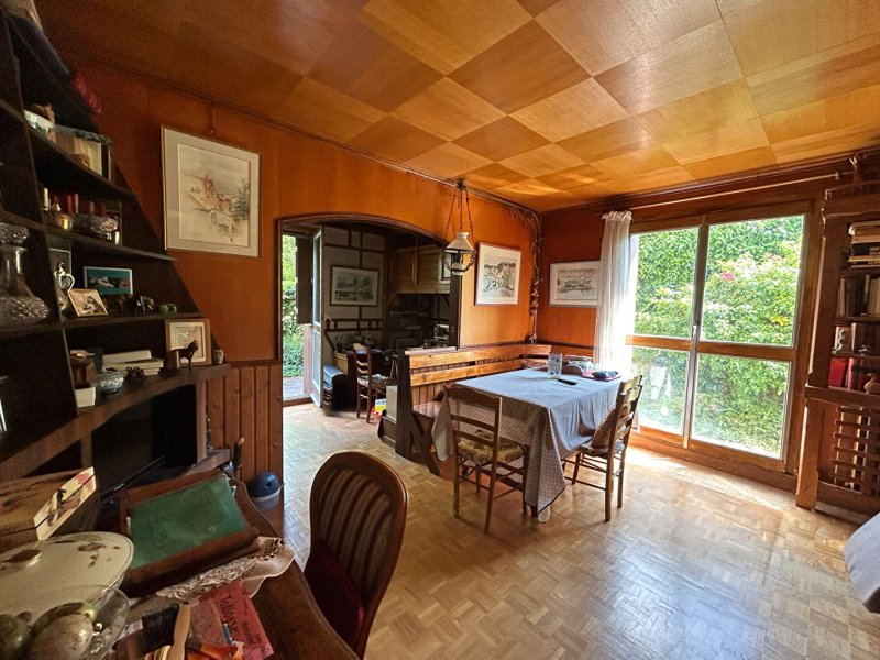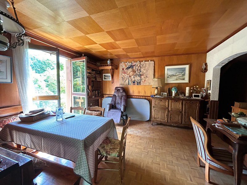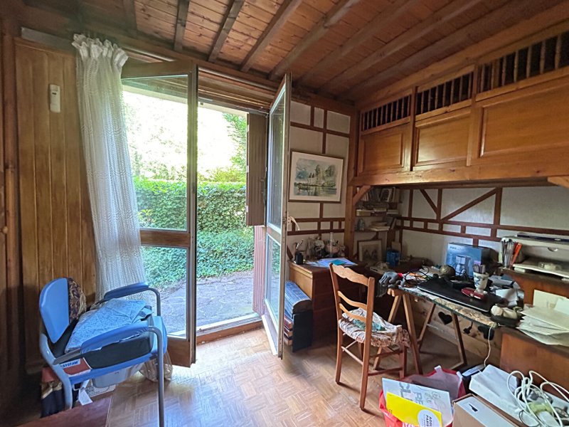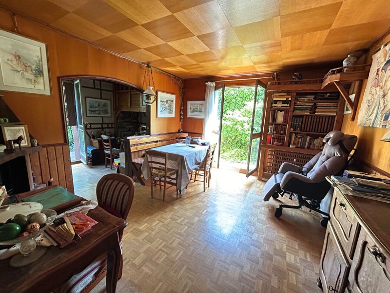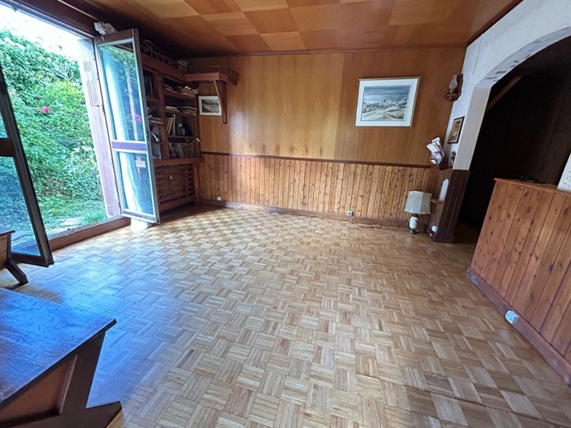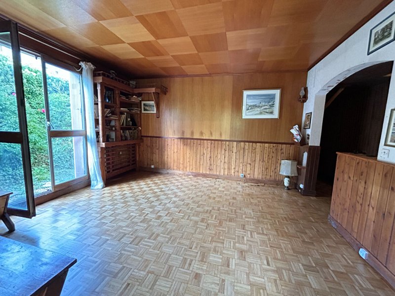 Il comprend une entrée, un séjour double donnant sur une terrasse et un jardin, un dégagement, deux chambres, une salle de bains et des WC. Une cave et un parking privatif sont également inclus.