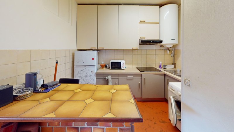 Situé au 2ème étage d'un bel immeuble ancien avec une belle cage d'escalier, ce bien se compose d'une entrée avec rangement, d'une chambre d'environ 12,50 m², d'un séjour avec une cuisine semi ouverte possédant tomettes au sol, d'un espace bureau d'environ 6 m² et d'une salle de bain avec WC.