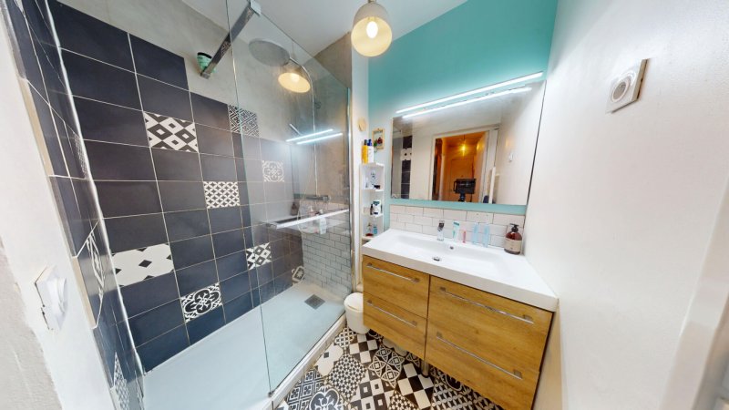 Salle d'eau moderne avec douche à l'italienne carrelée, sol effet carreaux de ciment, meuble vasque, sèche-serviette électrique.