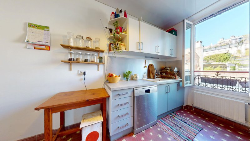 Cuisine indépendante de 9 m², avec carrelage ancien au sol, fenêtre double vitrage exposée Est sur cour, au calme.