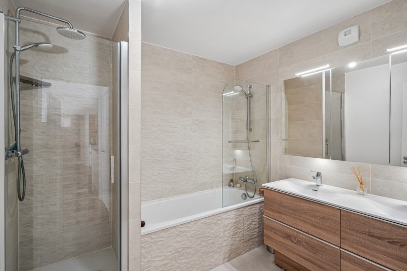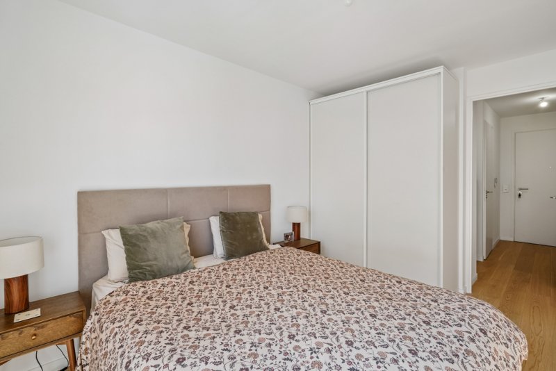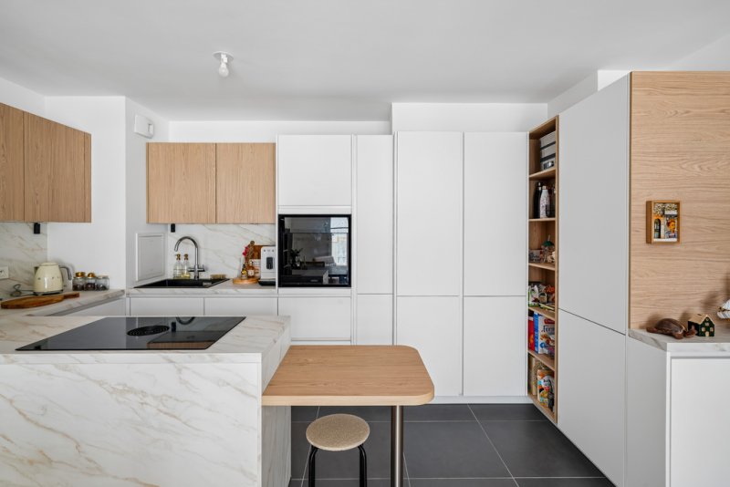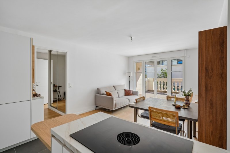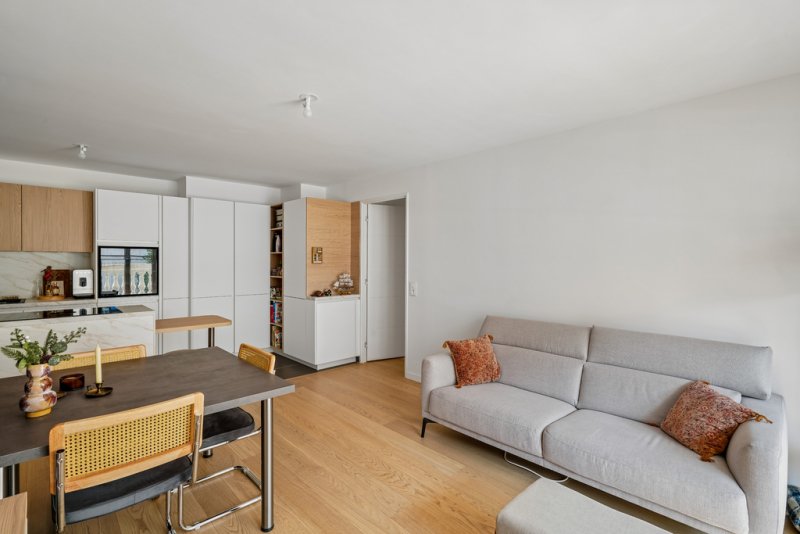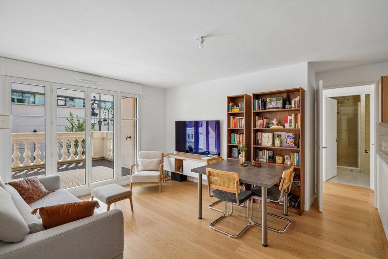 L'appartement bénéficie d'une pièce de vie lumineuse avec une cuisine américaine entièrement aménagée et équipée de matériaux haut de gamme. Cet espace s'ouvre sur une terrasse de 7,54m², prolongeant agréablement le séjour.