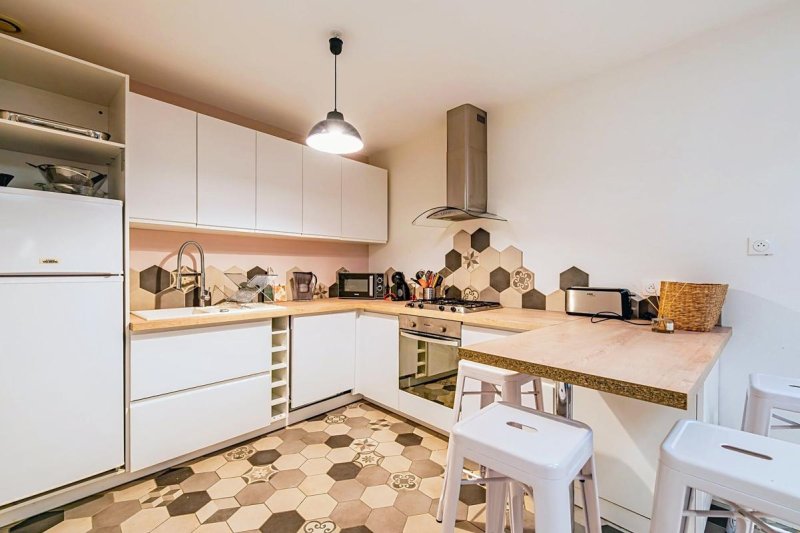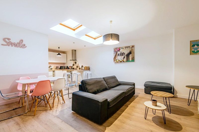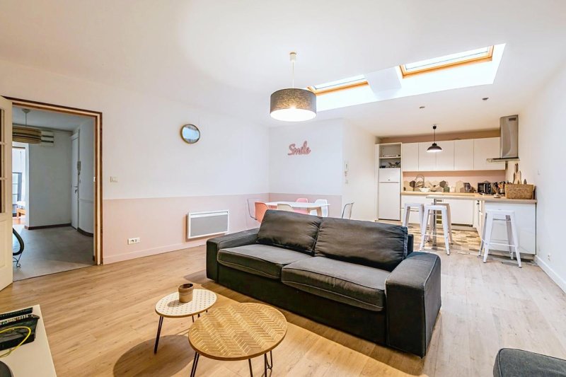 Dès l'entrée, un vaste salon/salle à manger baigné de lumière naturelle vous accueille chaleureusement. Cet espace de vie, ouvert sur une cuisine moderne entièrement équipée, est parfait pour partager des moments conviviaux en famille ou entre amis. Les deux chambres, spacieuses et lumineuses, offrent un cadre de vie paisible et reposant. La salle de bain, à la fois moderne et élégante, est dotée d'une baignoire et d'une douche, tandis qu'un WC séparé complète cet ensemble fonctionnel.