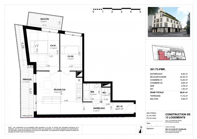 Appartement 3 pieces, comprenant entrée, séjour sur terrasse de 17m2, cuisine ouverte, 2 chambres, dont une avec balcon de 5 m2, salle de bain, wc séparé, parking en sous-sol, appartement au centre ville de Rosny-sous-bois, situé au 43 avenue du Général de Gaulle 93110 Rosny-sous-bois