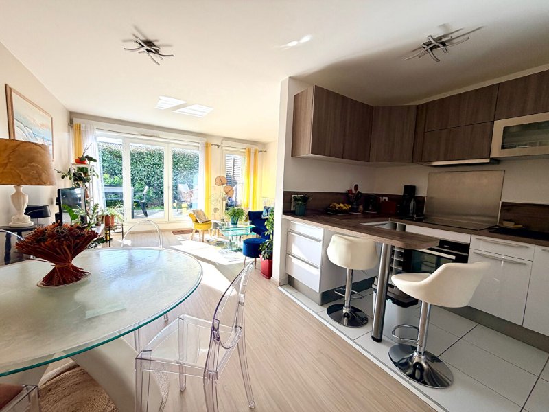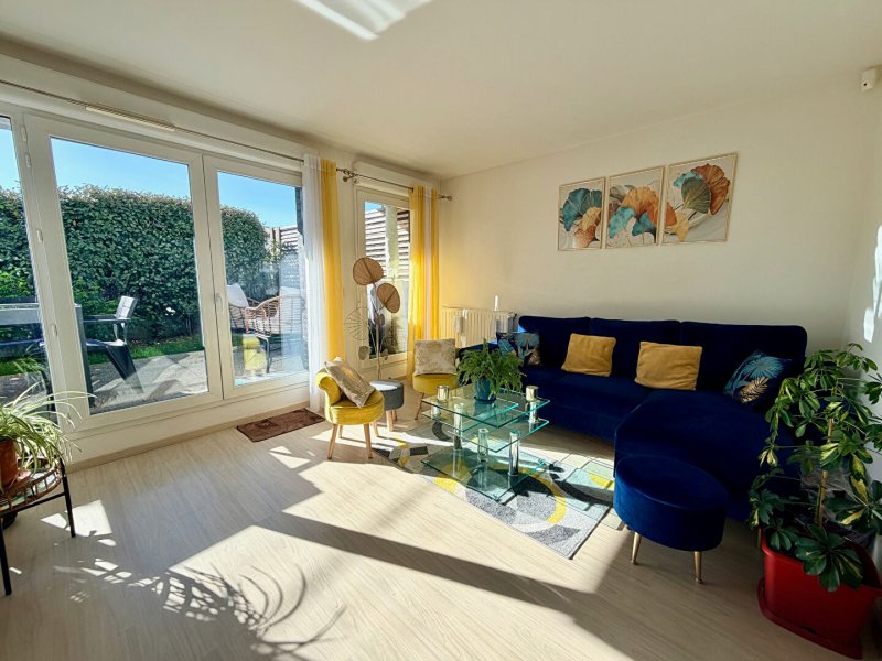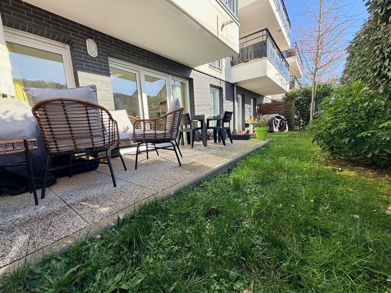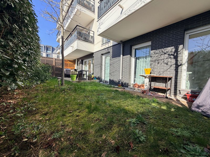 L'Agence à Frais Réduits vous propose, à 12 mn gare à pieds, quartier des Dix Arpents, dans une résidence de 2015, appartement 4 pièces en rez-de-jardin offrant: une entrée avec placards, séjour donnant directement sur terrasse et jardinet, au calme, sans vis à vis et exposés Sud-Ouest, cuisine ouverte aménagée et équipée, 3 chambres donnant sur jardin, dressing, une salle de bains, une salle d'eau, WC.