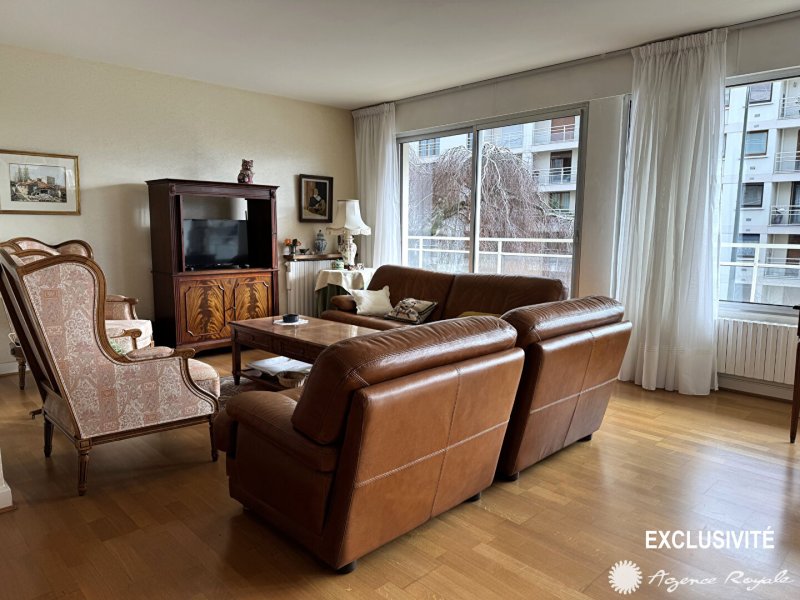 Dans Résidence avec ASCENSEUR, Appartement de 108,18m² Carrez + BALCON de 19m² : Entrée, Séjour avec parquet de 42m² sur BALCON de 19m², Cuisine équipée, Cellier, 3/4 Chambres de 10-11et 15m² dont une avec Salle de Douche et une sur BALCON, Salle de Bains, Cave, PARKING sous-sol, PARKING extérieur.