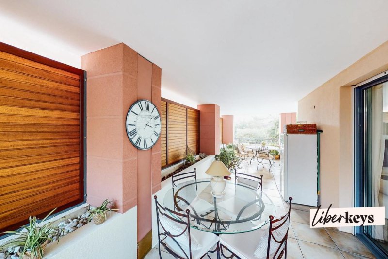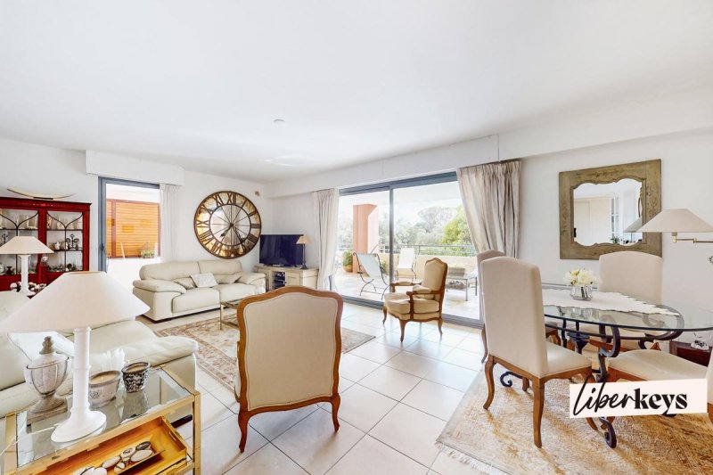 Au rez-de-jardin surélevé d'une résidence de standing sécurisée, cet appartement traversant offre une superbe luminosité grâce à son exposition sud et de larges ouvertures sur une terrasse exceptionnelle de 57 m², véritable pièce à vivre supplémentaire idéale pour profiter pleinement du climat de la Côte d'Azur. La piscine longeant le golf n'est pas loin ! Avec une cuisine équipée et indépendante de 9 m², un séjour convivial de 29 m² et deux chambres confortables (12, 10 m²) ainsi qu'une master bedroom de 13 m² avec sa salle d'eau, le plan est pensé pour le confort familial avec des volumes généreux.