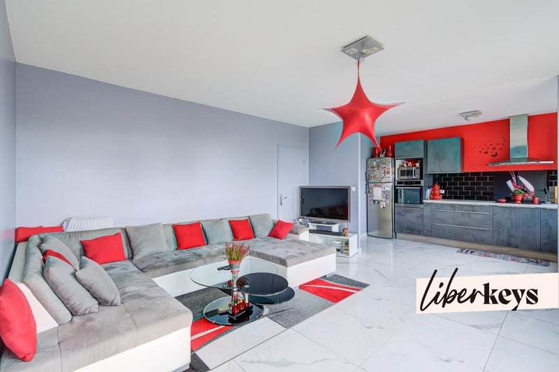 Une grande pièce de vie baignée de lumière, ouverte sur une cuisine moderne, aménagée et équipée.