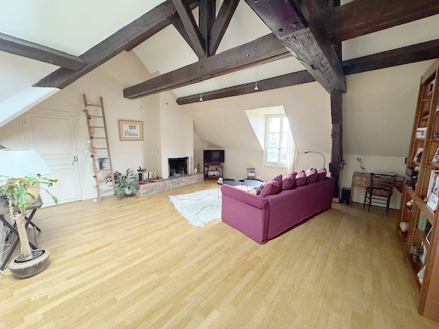 L'AGENCE DE VILLENNES vous propose un bel appartement rénové avec goût, intégré dans une grande maison des années 1900 située dans un quartier résidentiel recherché. Il se compose d'une entrée sur une lumineuse pièce à vivre avec cheminée et une belle poutraison d'origine, une cuisine équipée semi-ouverte, 4 chambres dont 1 avec placard, grenier dans le clocher, dégagement avec placard organisé en bureau, salle de bains, salle d'eau, toilettes. Un atout supplémentaire: Une jolie dépendance de 26 m2 composée d'une pièce pricipale, cuisine équipée donnant sur le jardin, salle d'eau, toilettes. Deux caves, 2 places de parking. Terrain arboré de 1400 m2 avec terrasse et jolie vue dégagée. La copropriété de 9 lots bénéficie d'un court de tennis en commun. A moins de 10 minutes à pied du centre, commerces, écoles et gare de Villennes (futur RER E). Accès rapide A13/A14.