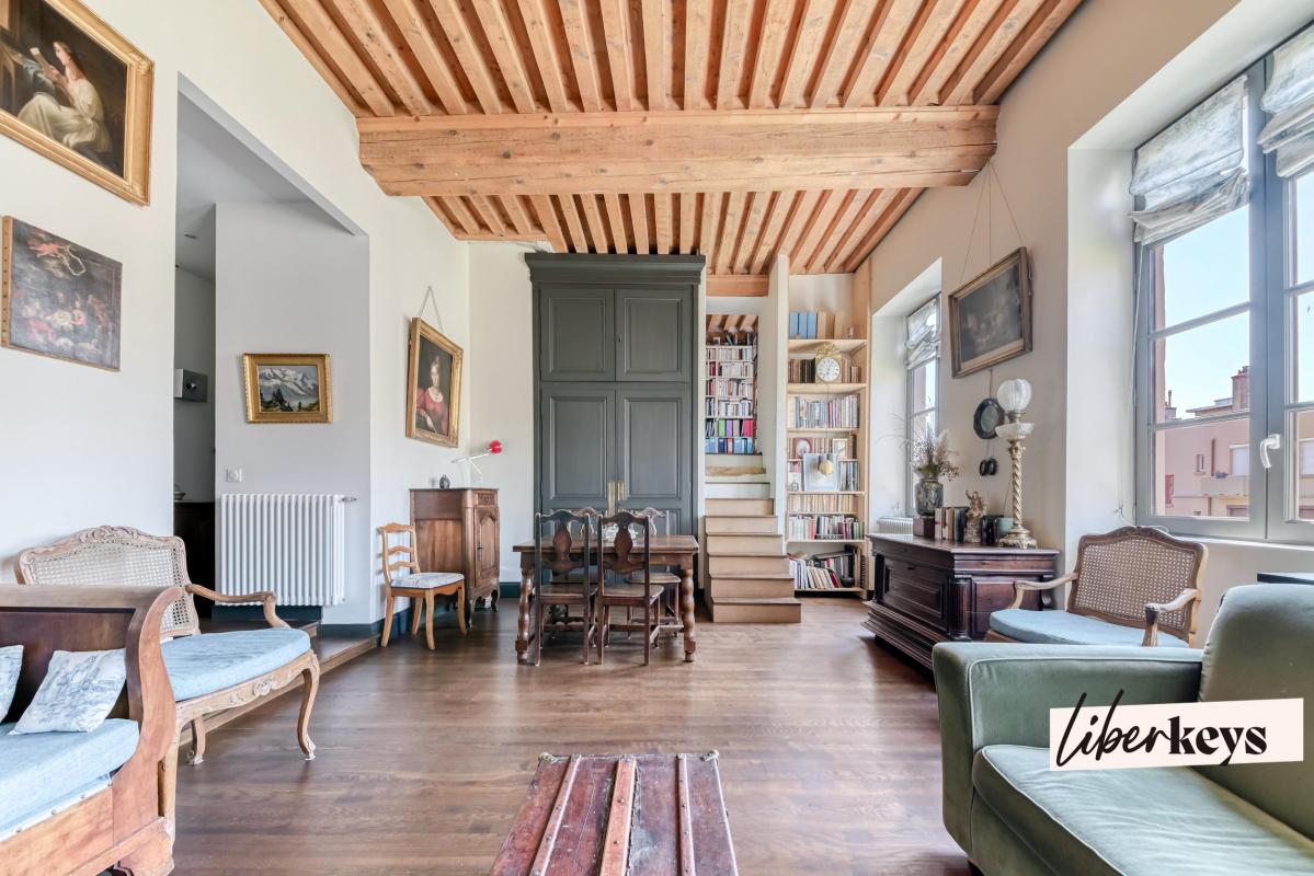 En exclusivité : Situé Rue Neuve à Lyon 1er, célèbre pour ses bonnes adresses de restaurants, au 5ème et dernier étage sans ascenseur d'un bel immeuble du 15ème siècle, cet appartement de charme de 139 m2 est très lumineux grâce à ses nombreuses ouvertures et sa situation en étage élevé. Complètement atypique, il est issu de la réunion de plusieurs appartements et occupe la totalité de l'étage. Son entrée dessert côté Sud , une cuisine équipée et salle à manger de 26,5 m2 avec grand cellier attenant, un salon de 17 m2 , une chambre, une salle d'eau avec WC. Côté Nord, la coursive éclairée de ses grandes fenêtres mène aux 2 chambres supplémentaires, au bureau, à la salle de bains et au 2ème WC. Enfin, un escalier conduit à l'endroit tout à fait exceptionnel de cet appartement, une chambre de 19 m2 avec une vue remarquable sur les toits de Lyon, Fourvière, les tours de l'église Saint-Nizier et le dôme de l'hôtel de ville. L'appartement est vendu avec un grand grenier directement accessible depuis l'appartement et 2 caves en sous-sol. L'emplacement est de tout premier choix, au coeur de la presqu'île, avec toutes les commodités, écoles (Collège et lycée Ampère), commerces de quartier et transports à proximité. 3 Parkings à moins de 300 mètres. Chaudière basse température au gaz de ville (1750 EUR par an) Huisseries en double vitrage. DPE : D. Faibles charges de copropriété : 110 euros / mois - Taxes foncières : 1368 euros Les informations sur les risques auxquels ce bien est exposé sont disponibles sur le site Géorisques : www.georisques.gouv.fr Pour visiter et vous accompagner dans votre projet, contacter Geneviève KANOUTE au 06 61 42 81 68 ou par courriel : genevieve.kanoute@harmonyimmo.fr
