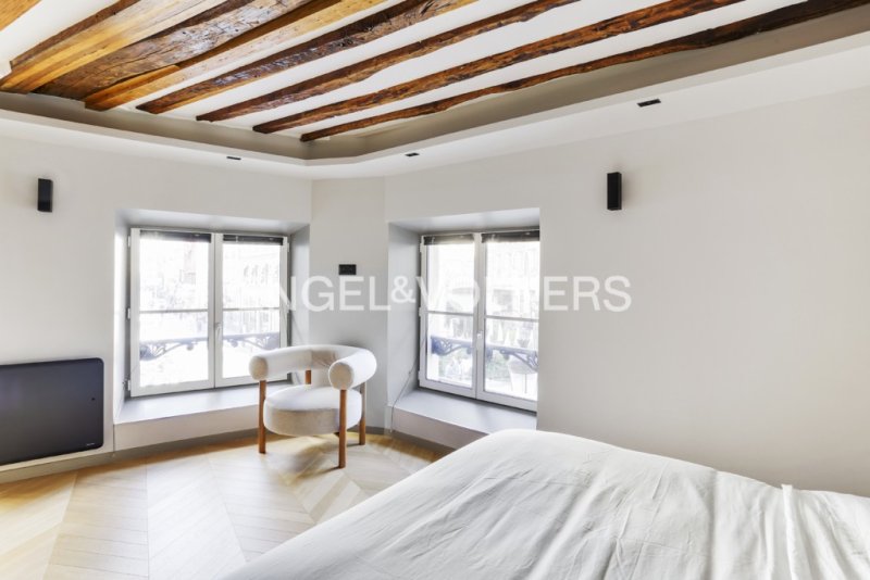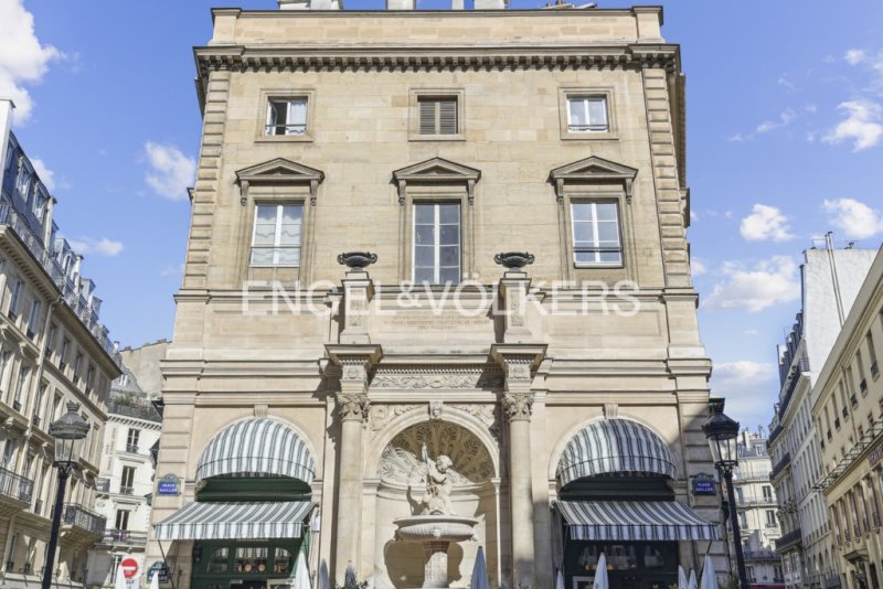 Le parquet en point de Hongrie et les poutres apparentes préservent tout le charme de l'ancien et les nombreuses fenêtres offrent une vue claire et dégagée sur la fontaine Gaillon.