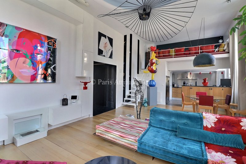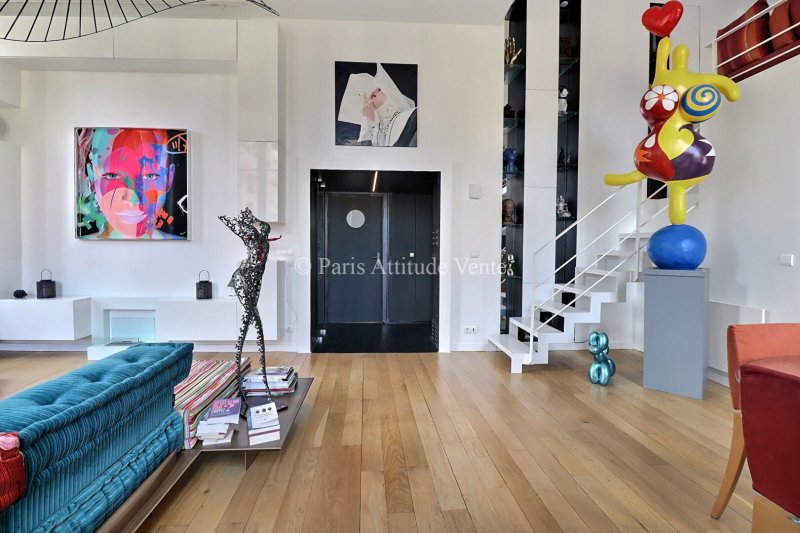 Un escalier mène à une mezzanine supérieure organisée autour du vide sur séjour, desservant deux chambres supplémentaires, chacune disposant de sa salle d'eau avec WC, ainsi qu'un second dressing. Ces espaces présentent par endroits une hauteur sous plafond plus basse, participant au charme chaleureux et atypique de l'ensemble. L'appartement offre ainsi 4 chambres (dont une utilisée actuellement comme bureau), dans une configuration modulable et harmonieuse.