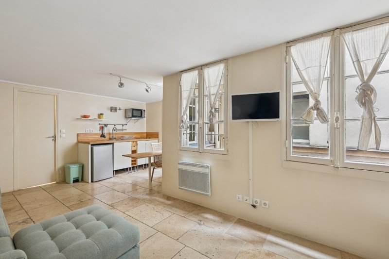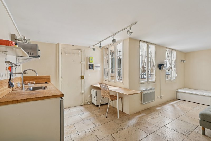 Situé au 3ème étage par escalier, dans un immeuble ancien du 18e siècle. Il comprend une entrée avec une cuisine ouverte, une salle d'eau WC, une buanderie dressing et l'espace salon avec coin couchage.