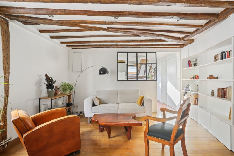 La pièce de vie, orientée Est et tournée vers la petite cour, constitue le véritable centre de l'appartement. Poutres, parquet et rangements intégrés sur mesure contribuent à une atmosphère chaleureuse et authentique, tout en permettant une optimisation fluide de l'espace.