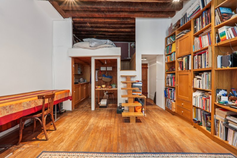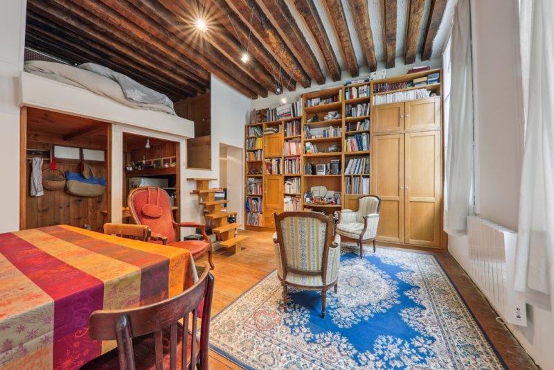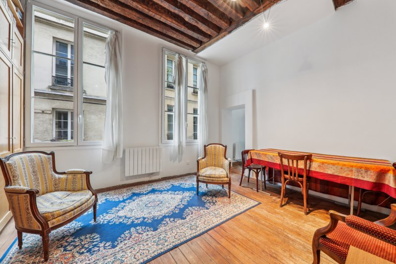 L'appartement bénéficie d'une vue agréable sur une rue piétonne et d'une atmosphère propre au Vieux Paris. Chaque détail raconte l'histoire d'un quartier chargé de caractère.
