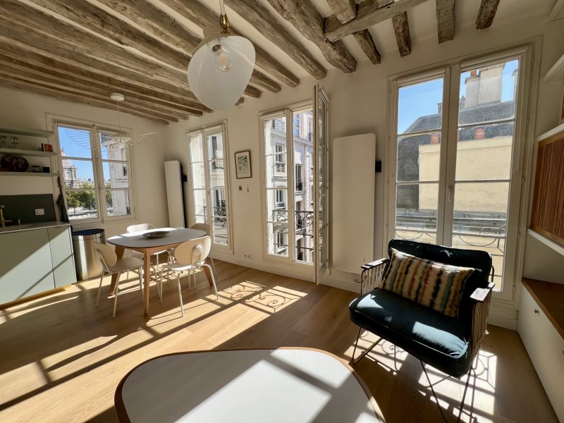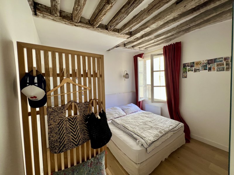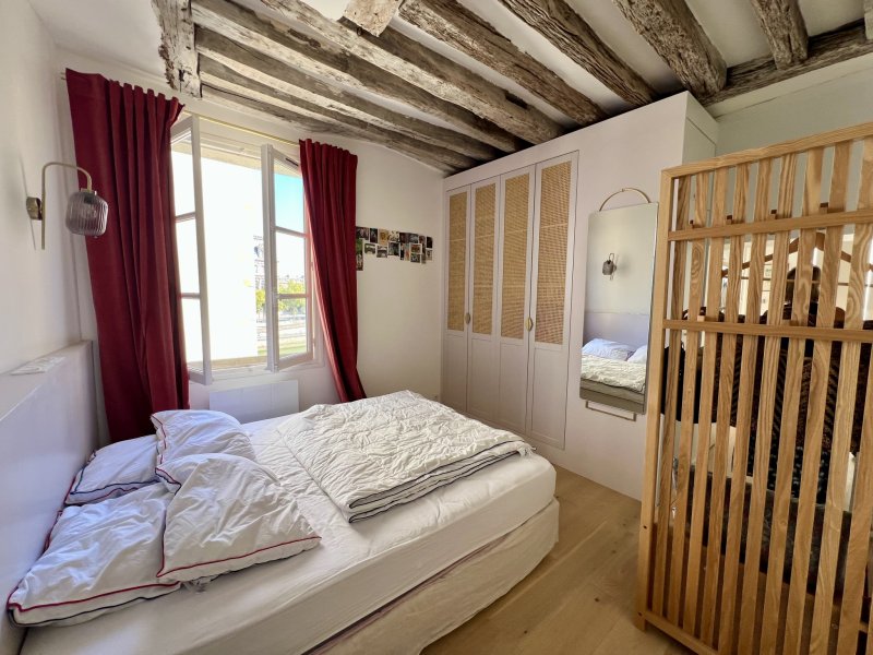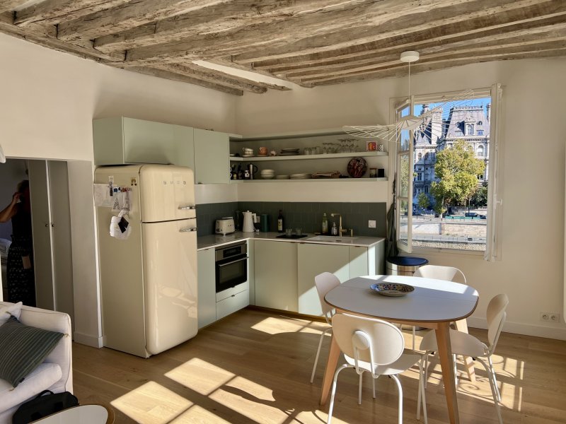 Ile de la Cité - Notre Dame, Exceptionnel appartement d'angle avec vue sur la Seine et l'Hôtel de Ville de Paris, immeuble historique 1750, appartement rénové avec de jolies vues, 4 eme étage, séjour 24 m2 avec cuisine américaine, chambre vue Seine, sde-wc, buanderie, placards, poutres, parquets, très belle rénovation d'un appartement calme et ensoleillé, très lumineux, proche Notre Dame et Quai aux Fleurs, métro 04 Cité à 4 minutes, RER B Saint Michel 5 minutes.