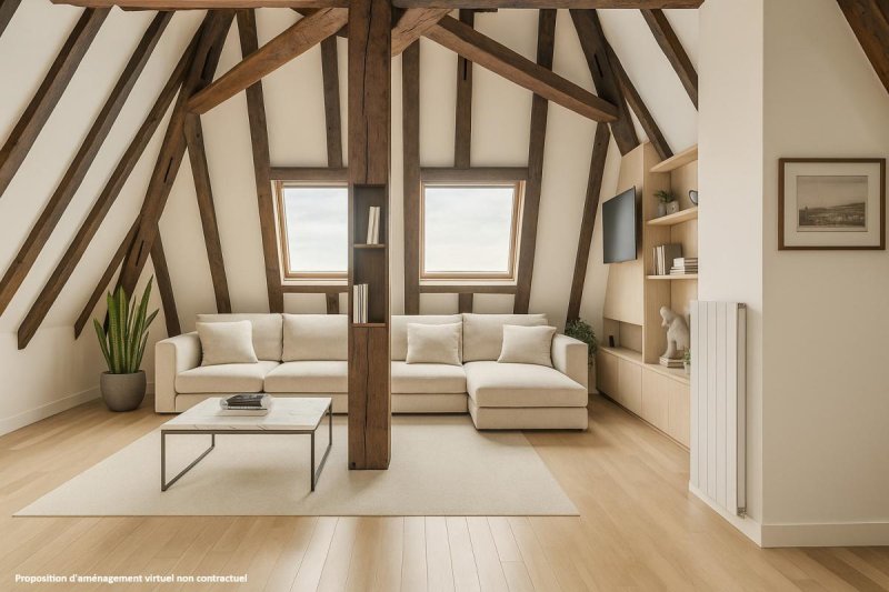 Cet espace est à présent un loft, composé d'une chambre, une cuisine ouverte sur le séjour, une salle de bains, un WC, une chambre/bureau, plusieurs espaces en mezzanine à redéfinir pour admirer la vue plongeante exceptionnelle sur la place des Vosges.
