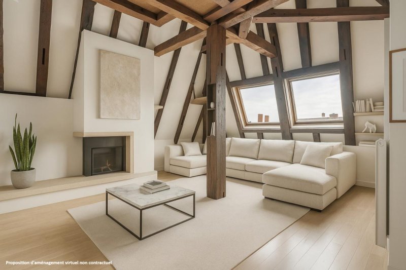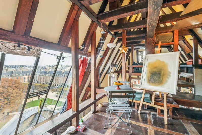 A la fois loft et appartement de réception, il se compose ainsi : chambre, cuisine ouverte, salle de bains, toilettes séparées, bureau et enfin un salon 'suspendu' idéal pour admirer la vue plongeante exceptionnelle sur la place des Vosges.