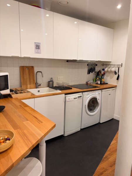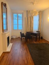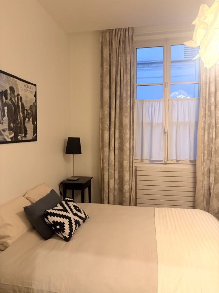 Entrée, séjour donnant sur la place offrant une vue dégagée, coin bureau, cuisine avec coin repas, chambre sur cour arboré, salle de douche, dressing. Wc indépendant. Parfait état, très beaux volumes et hauteur sous plafond. Double vitrage totale. Chauffage collectif. Cave en sous-sol.