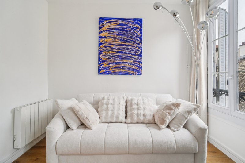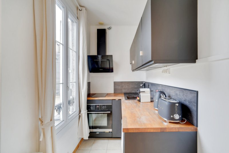 L'espace, entièrement meublé, révèle un parquet élégant et offre une vue dégagée sur les toits de Paris, conférant au lieu un charme parisien authentique.