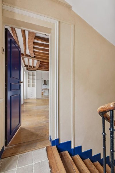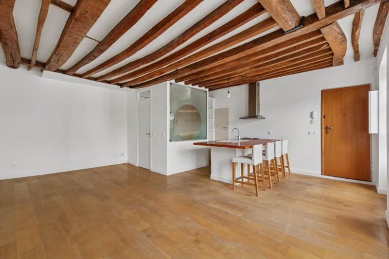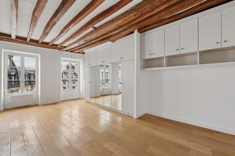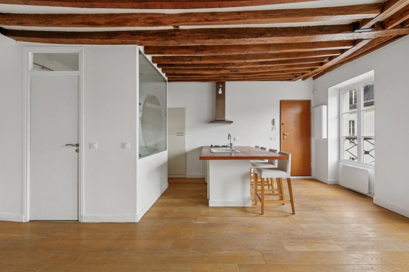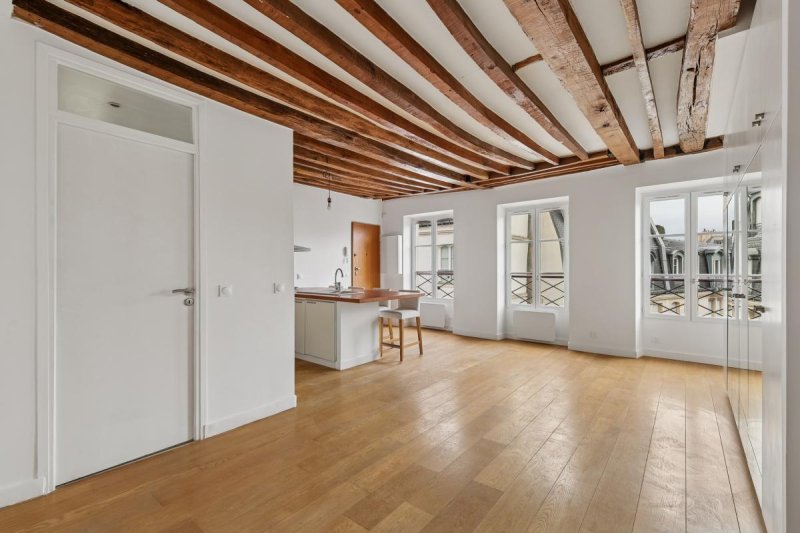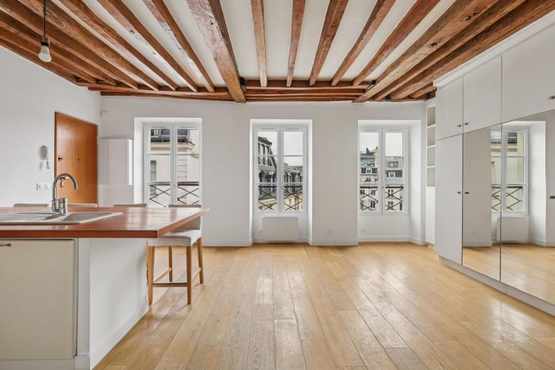 L'atmosphère du studio séduit par une élégance discrète, le caractère des poutres apparentes, un parquet en chêne et une bonne optimisation de la surface. Idéale pour un art de vivre parisien, chic et contemporain.