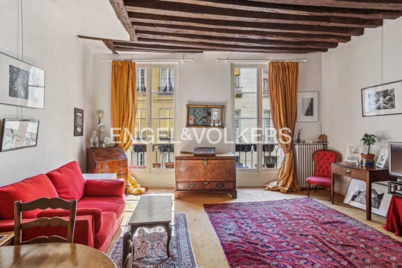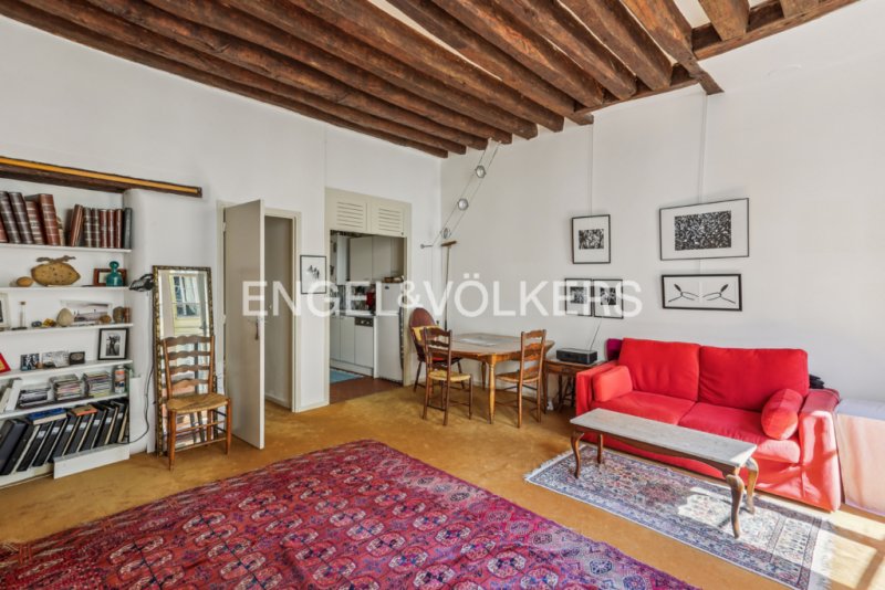 Avec beaucoup de charme cet appartement bénéficie de belles poutres, de grandes fenêtres avec une hauteur sous plafond de 3,30m et offre luminosité et calme.