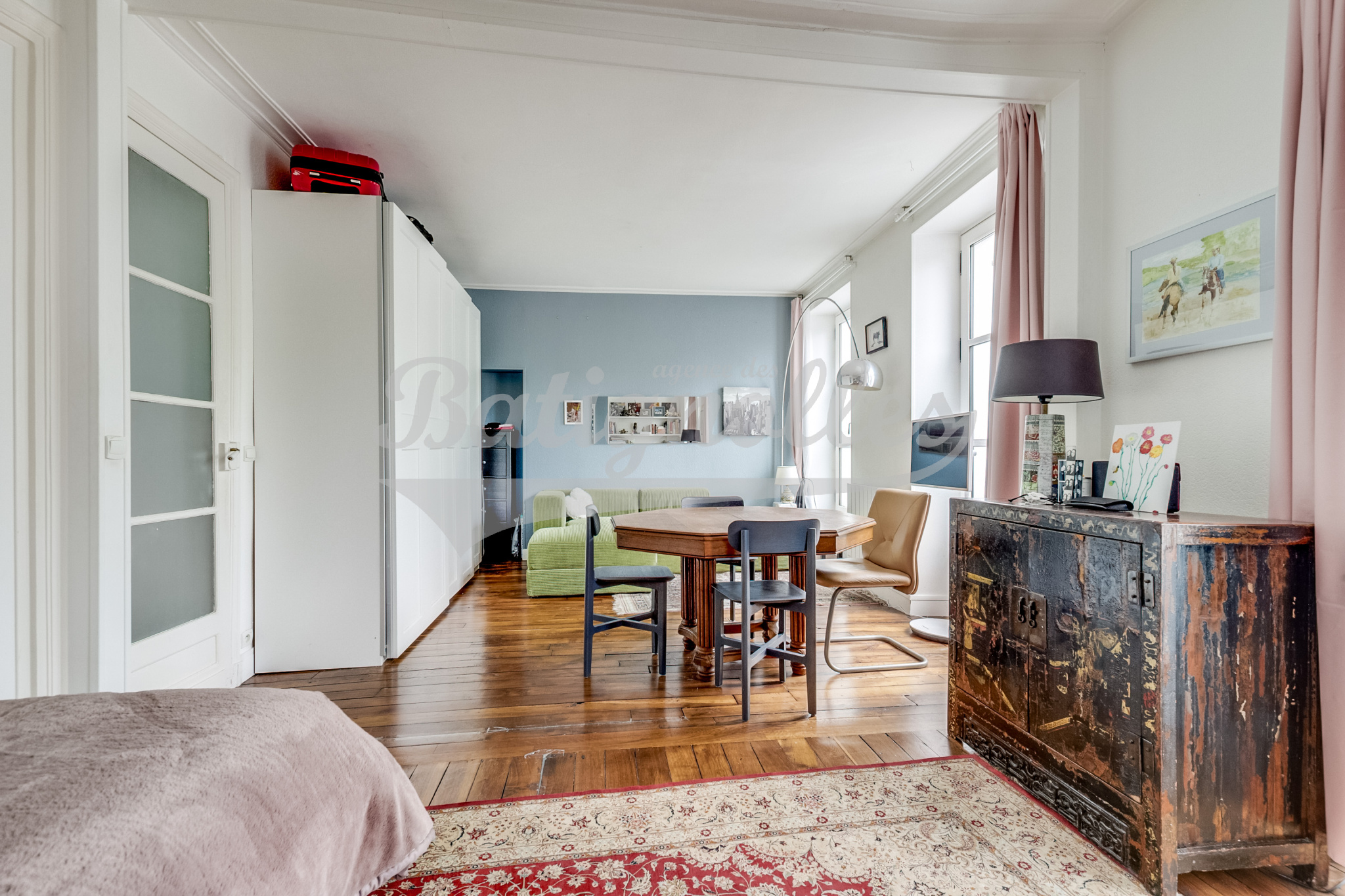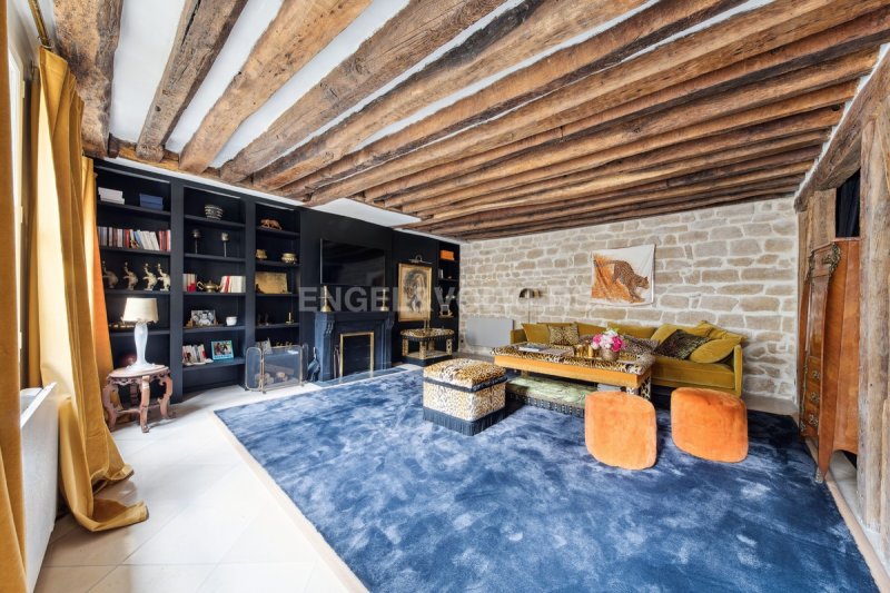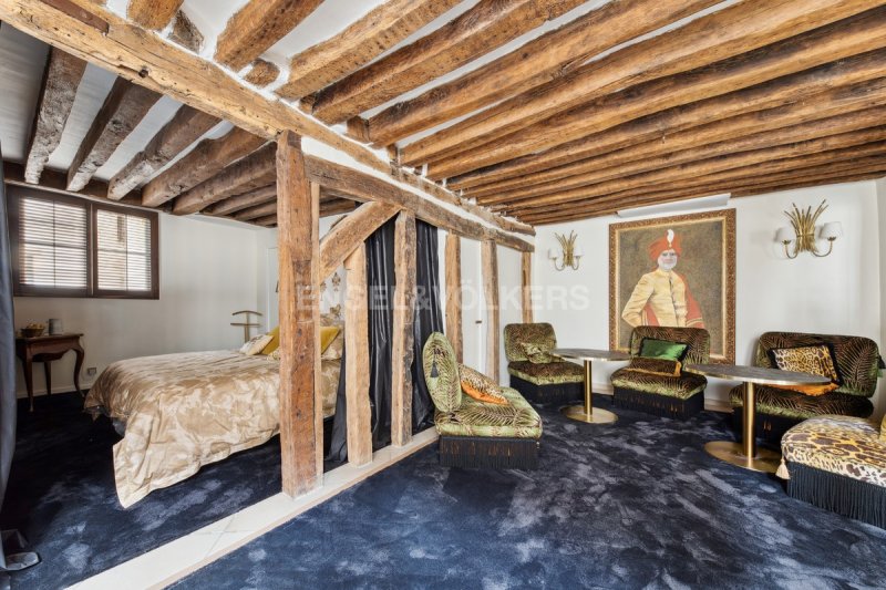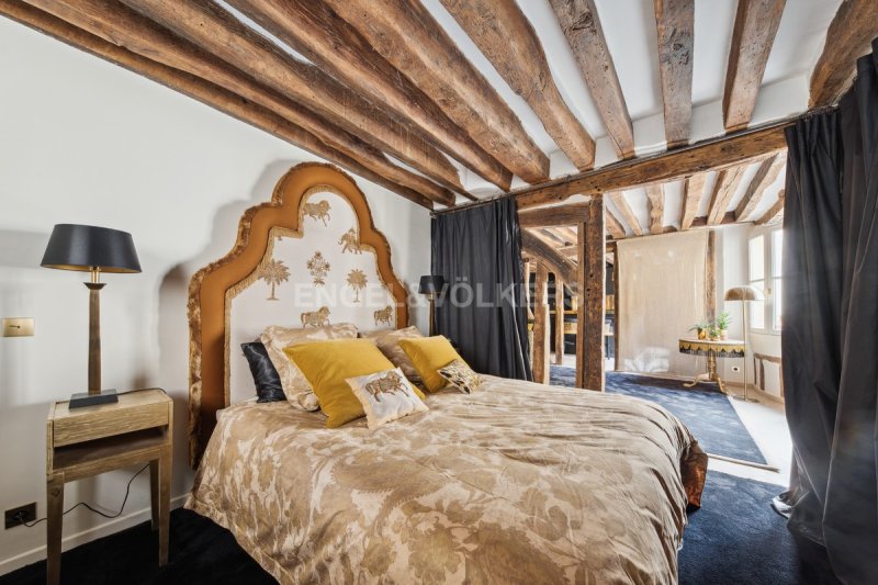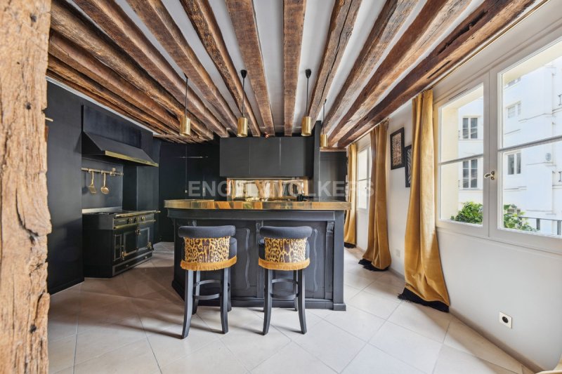Saint-Germain-des-Prés - Dans un bel immeuble du XVIIIème siècle, idéalement situé entre les quais de Seine, l'Institut de France et le carrefour de l'Odéon, Engel&Völkers vous propose ce pied-à-terre entièrement rénové avec poutres apparentes au troisième étage. L'appartement meublé, d'une surface de 89m² Carrez est composé d'une galerie d'entrée, un salon, une salle à manger, une cuisine ouverte, une chambre avec dressing, une salle d'eau et des toilettes séparées.