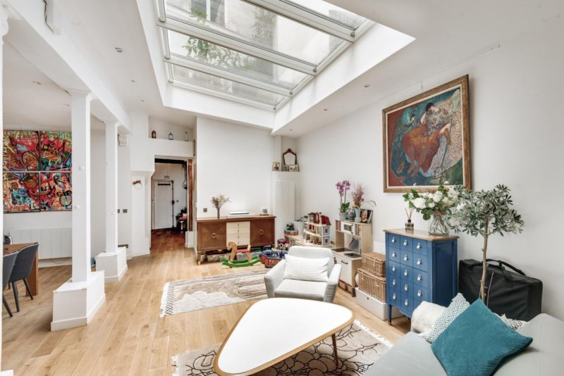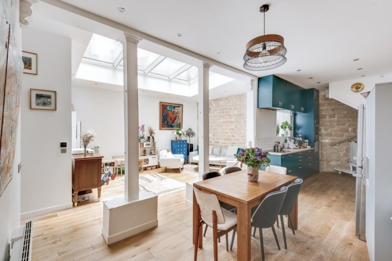 Au rez-de-chaussée, bénéficiant d'une belle hauteur sous plafond (3,8m HSP) et d'une verrière se trouve un grand séjour avec salle à manger et cuisine ouverte, toilettes indépendantes.