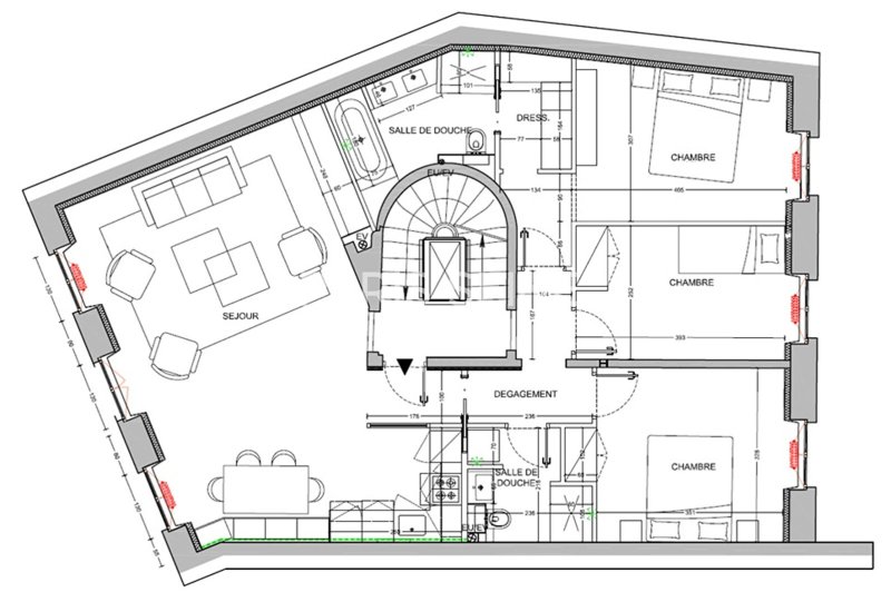 Seul au 3ème étage avec ASCENSEUR et d'une superficie de 94 m² loi Carrez, il comprend : une entrée, un séjour/salle à manger (trois fenêtres) avec un espace pour créer une cuisine d'une superficie de 41 m², une suite parentale avec espace dressing et sa salle de bains/douches avec un wc, deux chambres avec des rangements et une salle de douches avec un wc.