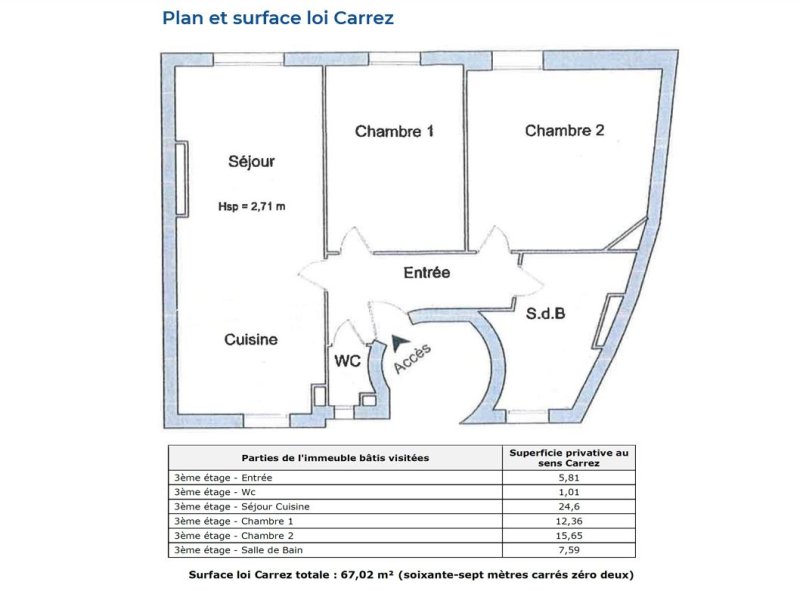 Situé au 3ème étage sans ascenseur et d'une superficie de 67,02 m² loi Carrez, il est composé d'une entrée, d'un séjour avec cuisine ouverte, de deux chambres, d'une salle de bain et d'un WC séparé.
