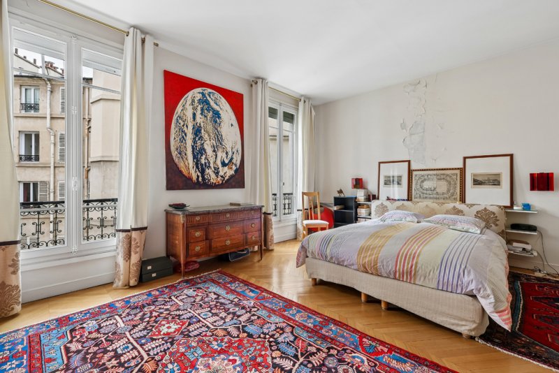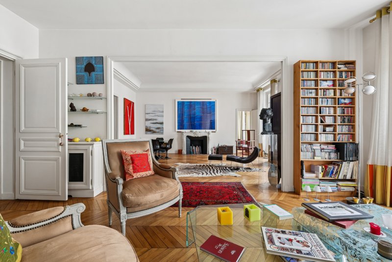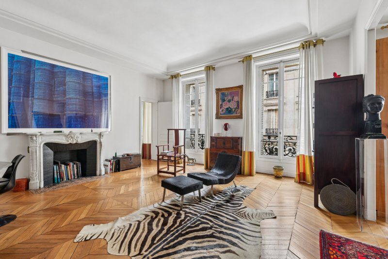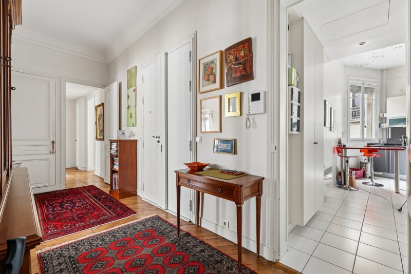Dès l'entrée, l'atmosphère séduit par ses volumes remarquables et son élégance classique. Le parquet en point de Hongrie, véritable signature du charme parisien, souligne avec raffinement l'authenticité des lieux. La hauteur sous plafond de 3,30 mètres confère à l'ensemble une majesté rare, tandis que le vaste double salon de réception, baigné de lumière naturelle, compose un espace de vie élégant, idéal pour recevoir dans un cadre distingué ou simplement profiter d'un quotidien d'exception.