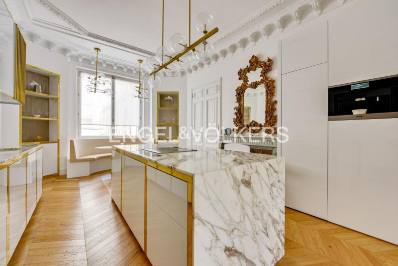 Les matériaux d'exception ont été soigneusement sélectionnés : marbre Calacatta Oro, menuiseries sur mesure, mobilier Fendi intégré, robinetterie Fantini, parquet point de Hongrie, moulures et corniches Auberlet & Laurent. Hauteur sous plafond de 3,46 m.