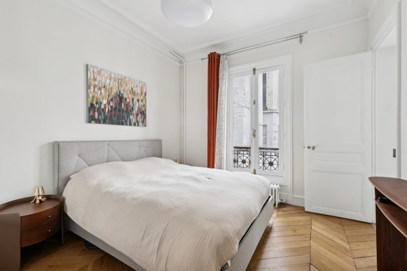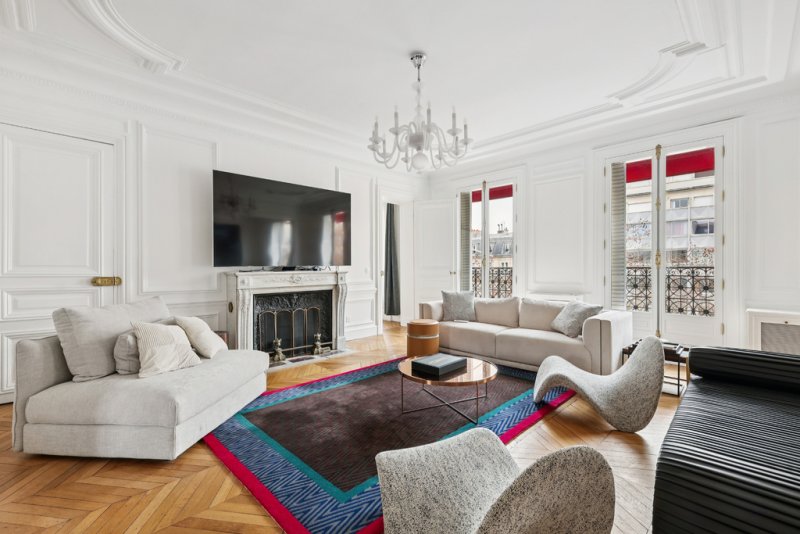 L'entrée mène à un double salon spacieux agrémenté de deux cheminées qui lui confèrent un certain charme. La salle à manger attenante et la cuisine séparée, entièrement équipée, créent un espace convivial et pratique. L'appartement est lumineux et met en valeur son esthétique classique.