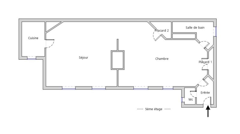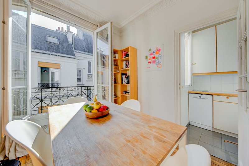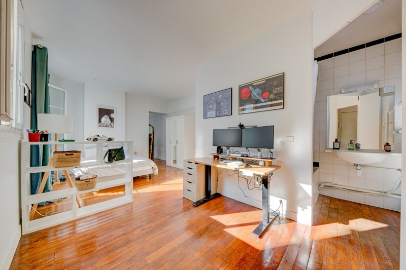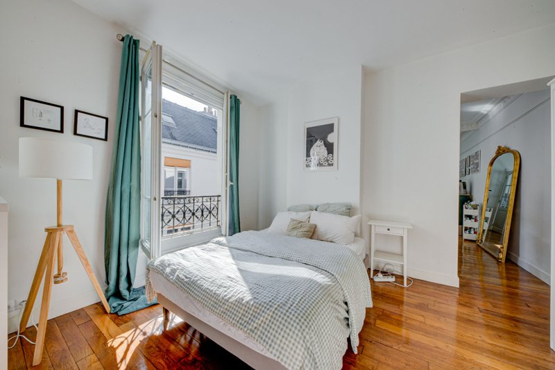 Rue Marguerite de Rochechouart - 2 p 53.80m² au 5éme étage sans ascenseur dans bel immeuble Hausmannien avec charme de l'ancien parquet / moulure et cheminée au 5éme sans ascenseur avec un plan inversé comprenant une entrée - une chambre avec salle de bain semi-ouverte - séjour - cuisine - WC séparés - chauffage et eau chaude électrique. Immeuble avec gardien Bien soumis au statut de la copropriété - syndic : ORALIA - quote-part charges annuelles : 1726 Euro dont 750 Euro locatif