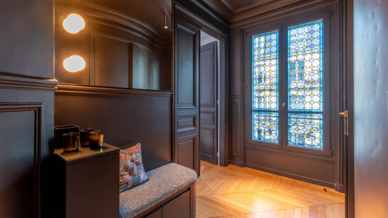Un dressing d'entrée et une banquette vous permettent de déposer vos affaires, tout en admirant une belle fenêtre aux vitraux d'époque, et depuis laquelle, on peut voir jusqu'à la basilique du Sacré Coeur.