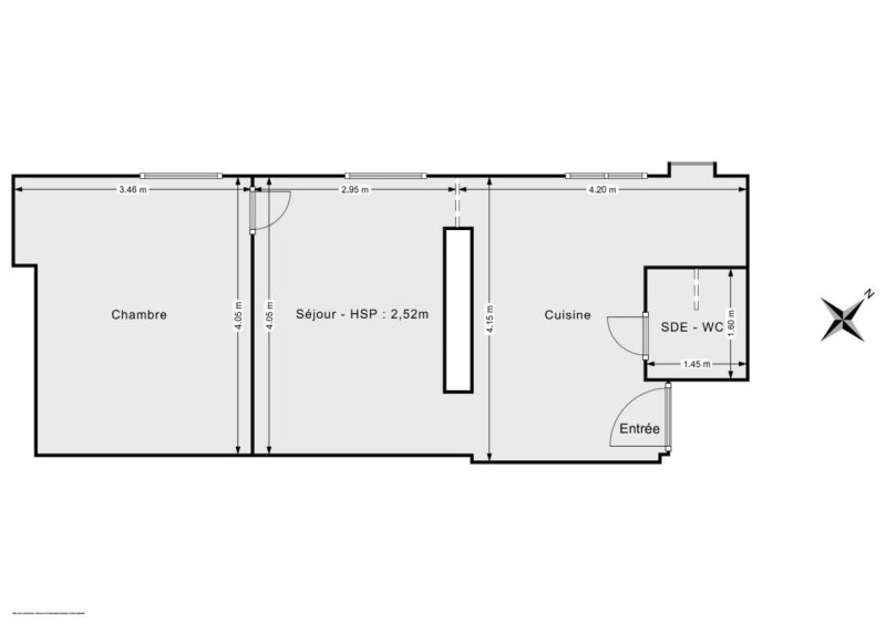 L'appartement comprend une cuisine semi-ouverte aménagée, un séjour lumineux, une chambre dotée d'un espace bureau et d'un dressing sur mesure, ainsi qu'une salle d'eau avec WC.