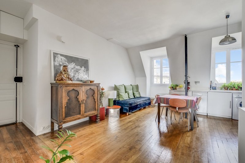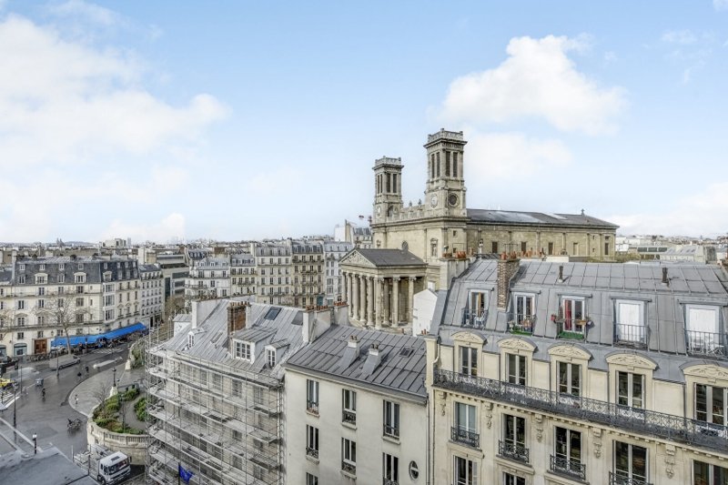 Il se compose d'une entrée, d'un premier séjour côté rue exposé Nord-Ouest, sans vis-à-vis, avec vue dégagée sur l'Eglise Saint-Vincent-de-Paul, d'une cuisine ouverte équipée et aménagée, d'un second séjour très lumineux côté cour intérieure exposé Sud-Est, d'une chambre calme sur cour également, ainsi que d'une salle d'eau avec WC.