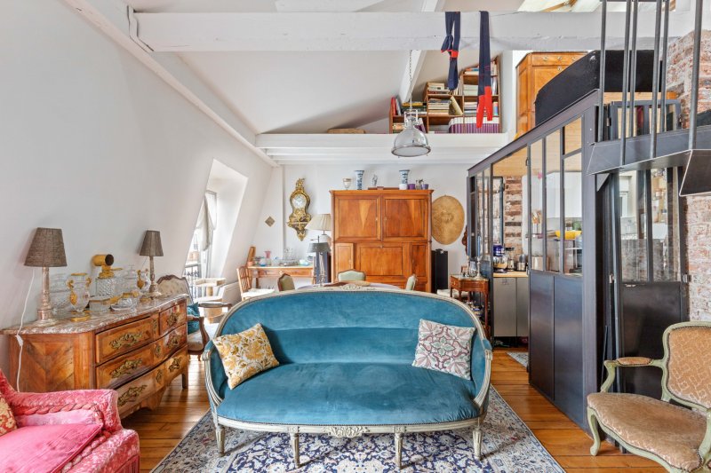 Paris 10ème, dans copropriété de charme des années 1880, gardiennée, dont les bâtiments intérieurs sont édifiés autour d'une pittoresque allée pavée et arborée, au 4ème et dernier étage, un exceptionnel loft de 2/3 pièces en duplex, d' environ 73 m2 au sol et 58 m2 carrez, très ensoleillé, plein sud. De plain pied, une entrée spacieuse éclairée par une belle fenêtre fait office d'agréable bureau, puis on accède à un séjour rectangulaire d'une trentaine de m2, présentant un vrai cachet avec ses pierres agraphées d'origine au mur, ses portes fenêtres et d'un volume appréciable grâce à une très belle hauteur sous-plafond... une cuisine américaine traversée par une lumière intense grâce à une grande fenêtre donnant sur l'extérieur d'une part et s'ouvrant sur le séjour d'autre part par d'élégantes cloisons métalliques vitrées, atypiques et conviviales. Un wc/ lave mains. On emprunte alors un escalier menant au niveau supérieur, de caractère, élaboré dans les combles, surplombant le séjour. On y trouve de nombreuses niches de rangements, un petit espace mezzanine ouvert à aménager, une vaste chambre et sa belle salle d'eau/wc/buanderie attenante. Prestations haut de gamme. Double vitrage, triple exposition. Bien extrêmement lumineux et chaleureux, calme et atypique, la tête dans les nuages....Une cave. Quartier branché, situé entre les grands boulevards et le canal Saint Martin, à proximité des transports et des commerces. A visiter rapidement! Les informations sur les risques auxquels ce bien est exposé sont disponibles sur le site Géorisques : www.georisques.gouv.fr