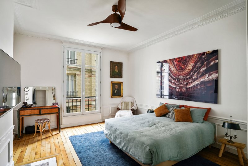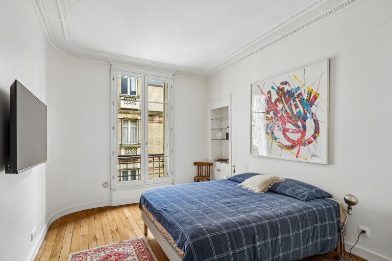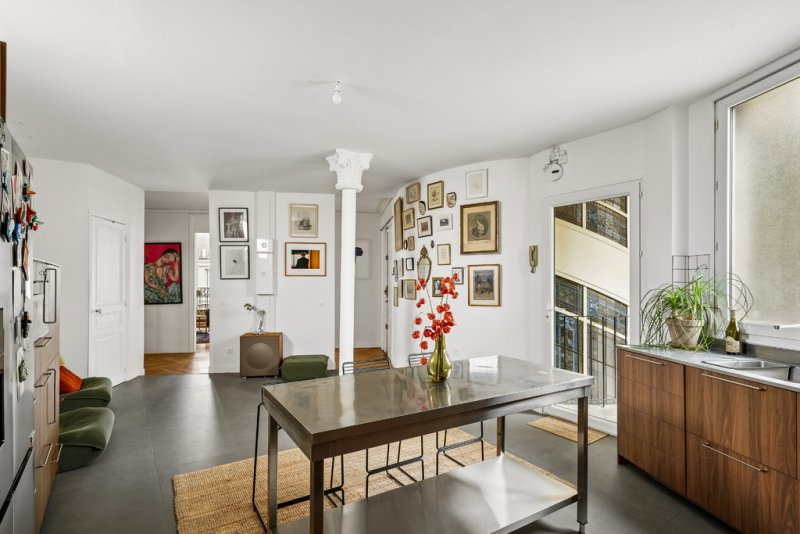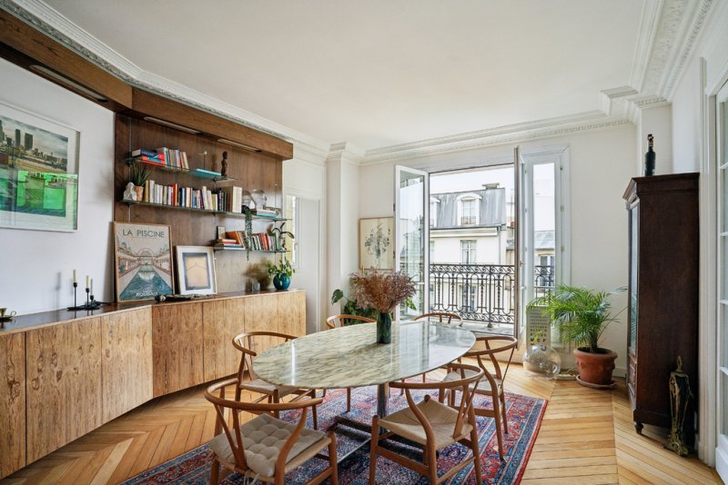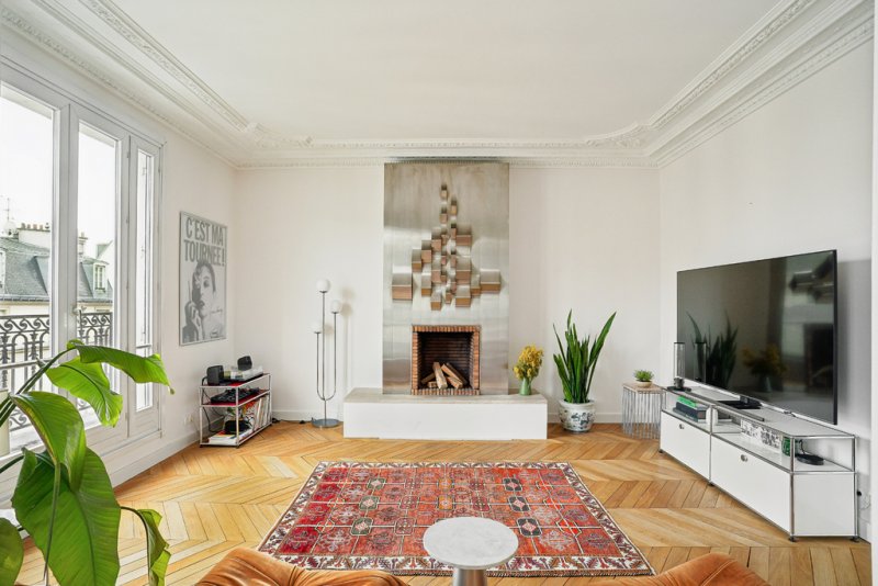 Le double séjour, exposé plein sud et prolongé par un balcon filant, bénéficie d'une atmosphère chaleureuse, sublimée par ses éléments d'époque -- cheminée, belles hauteurs sous plafond -- véritables signatures du charme haussmannien.