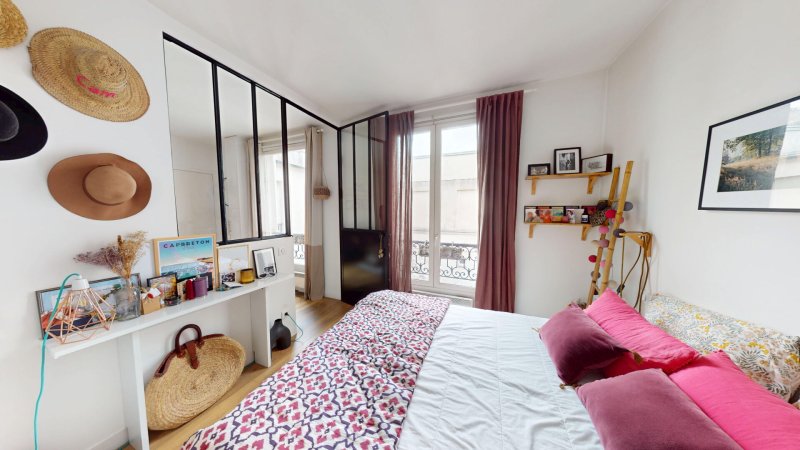 Séparée par une verrière, la chambre offre une atmosphère cosy et intime. Parfaitement agencée, elle dispose d'un espace suffisant pour un lit double et de rangements pratiques. Un véritable cocon au coeur de la capitale.
