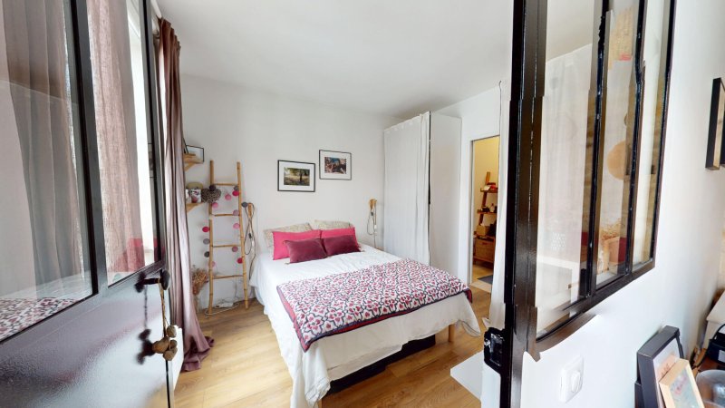 Séparée par une verrière, la chambre offre une atmosphère cosy et intime. Parfaitement agencée, elle dispose d'un espace suffisant pour un lit double et de rangements pratiques. Un véritable cocon au coeur de la capitale.