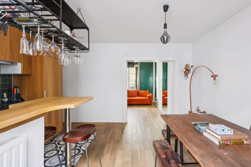 Un appartement trois pièces, traversant et fraîchement rénové, de 41m² (loi Carrez), situé au 1er étage d'un immeuble de 1900.