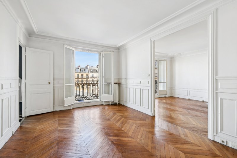 Le parquet point de Hongrie dans tout l'appartement, les larges portes-fenêtres, les moulures et les nombreuses cheminées en marbre avec trumeaux sont autant de beaux éléments d'époque qui pourront être mis à valeur dans une future décoration élégante.
