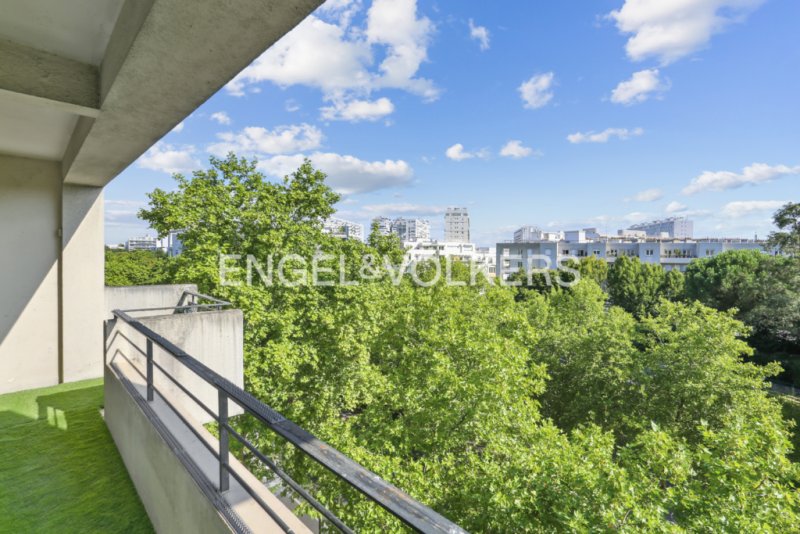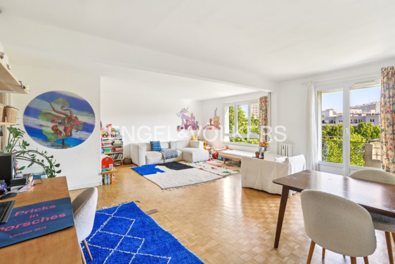 L'espace de vie se compose d'un vaste séjour de 40 m², baigné de lumière grâce à son exposition Est et ouvrant sur un balcon de 7 m², avec vue entièrement dégagée sur les arbres et le calme du quartier. Sans vis-à-vis, cet appartement bénéficie d'un environnement serein, rare à Paris.