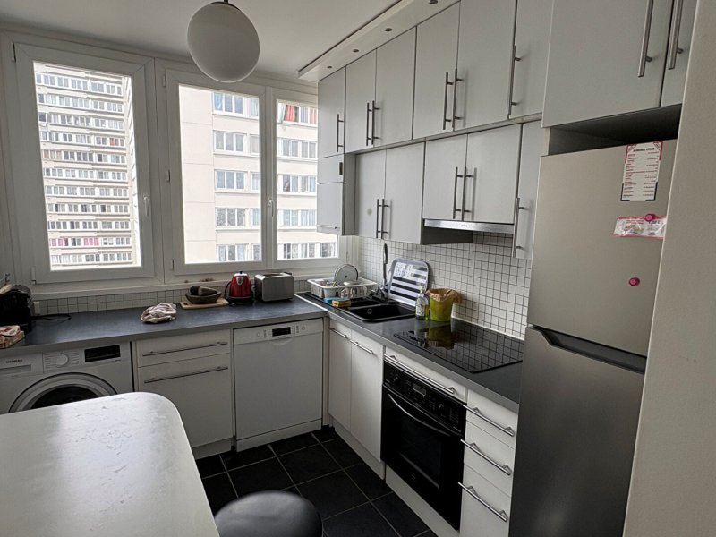 En étage élevé d'un immeuble récent avec gardien, 3 pièces de 71 m² environ comprenant une entrée avec dressing, séjour, cuisine, 2 chambres, cuisine séparée, SDB, WC séparé, cave et parking en sous-sol
