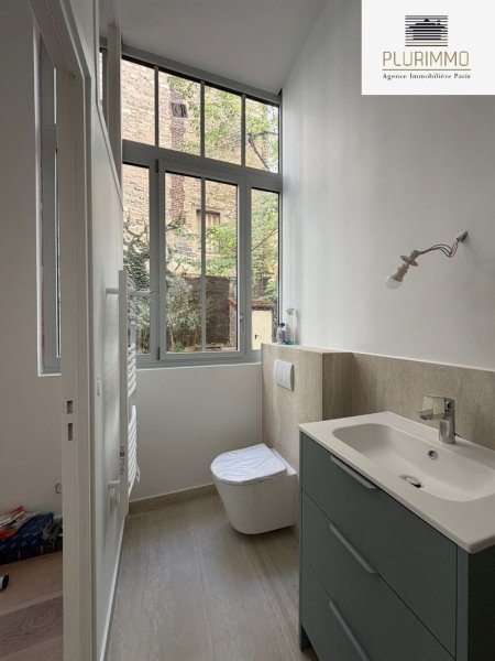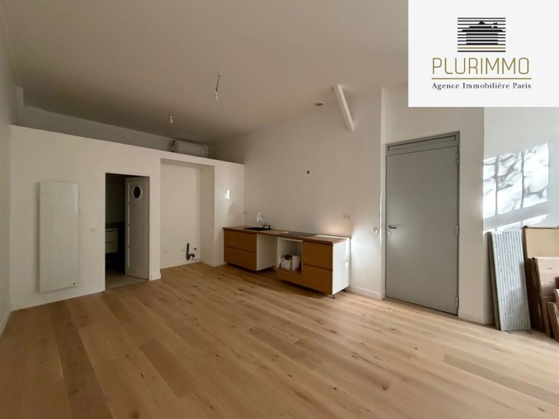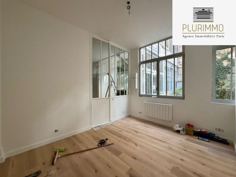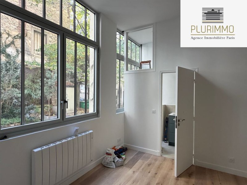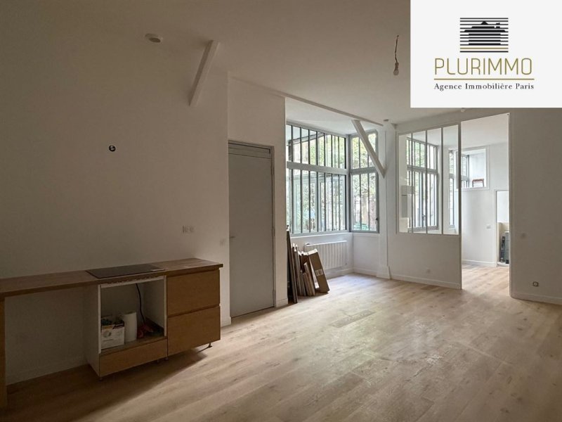Paris 14ème - Alésia. Dans un petite copropriété, atelier de 62.5m2 loi Carrez avec 3.70m de hauteur sous plafond. Il se compose d'un séjour avec cuisine ouverte, une chambre avec rangements, une salle de bains avec wc, une salle de douche avec wc, une petite mezzanine de rangements. Calme et lumineux, donne entièrement sur la cour/jardin de la copropriété. Taxe foncière 312€, charges de copropriété 85€/mois, DPE C, possibilité de profession libérale.