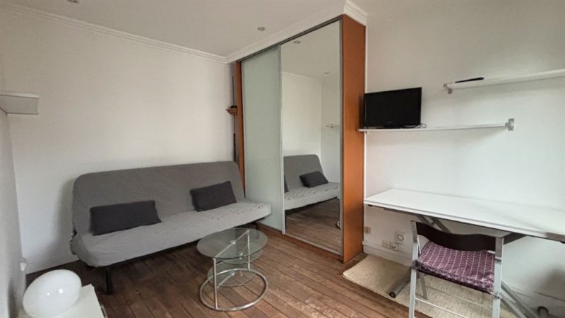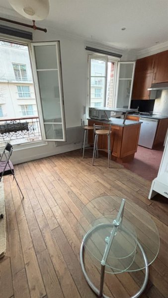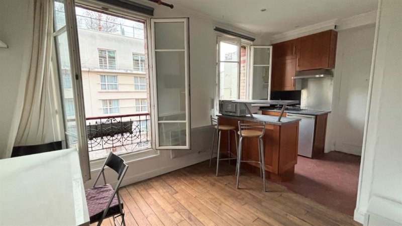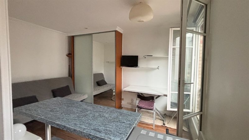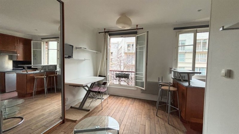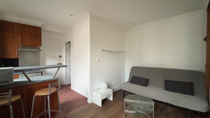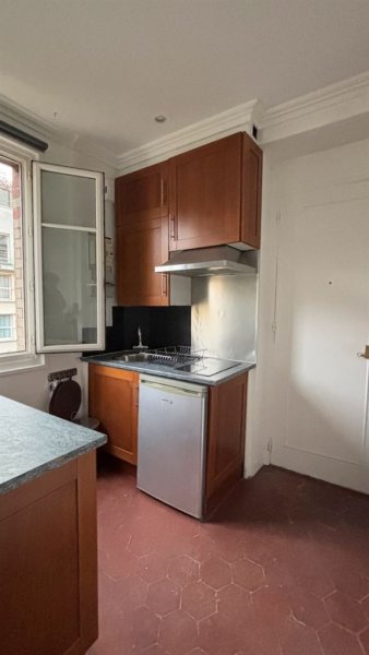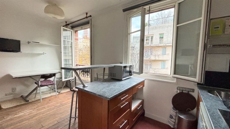 Paris 15è - Suffren/Fédération, Proche Champ de Mars, dans une impasse pavée privée et arborée, un ravissant studio avec vue Tour Eiffel sur grand jardin au calme. 22 m2 (21,41 m2 Loi Carrez), au 3ème étage, comprenant entrée, cuisine ouverte, 2 grande fenêtres double vitrage, coin couchage en alcôve. Une cave au sous sol.