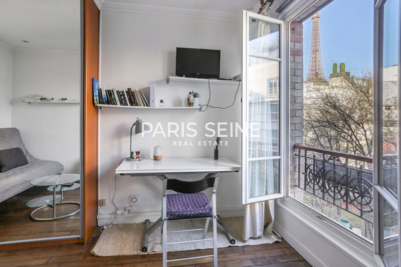 L'appartement, lumineux, offre une très jolie vue sur la Tour Eiffel. Ce bien propose un plan fonctionnel et se compose d'une pièce à vivre avec cuisine américaine et d'une salle d'eau avec WC et emplacement lave-linge.