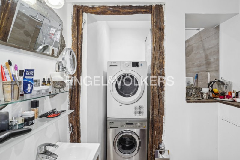 La salle de douche intègre un espace buanderie pratique, et l'ensemble de l'appartement offre de nombreux rangements intégrés, optimisant l'espace au quotidien.
