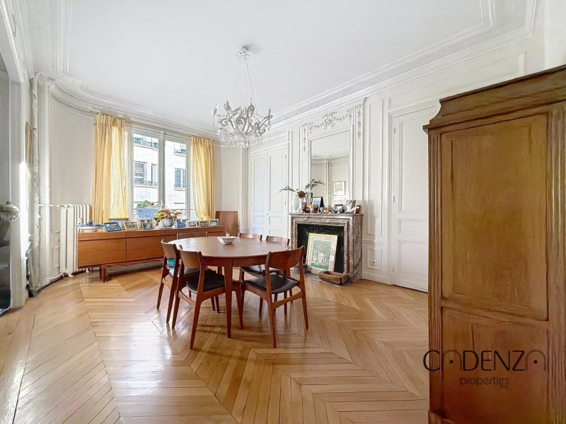 Dès l’entrée, une belle réception avec placard intégré mène à un salon et une salle à manger lumineux, chacun sublimé par une cheminée en marbre et faïence, signature du cachet parisien.